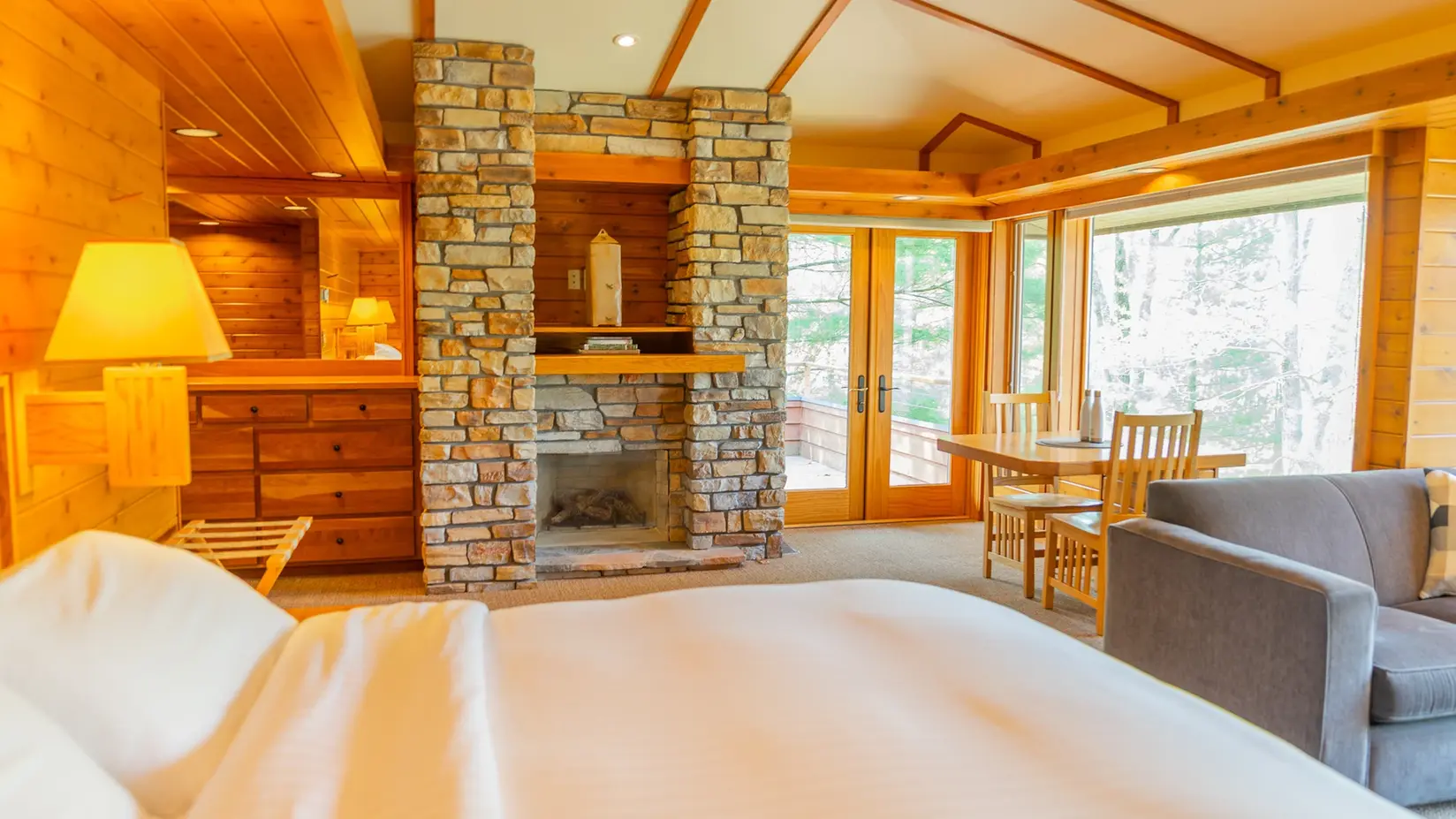 Experience the warmth and charm of our cedar wood interior rooms with a serene woods view. Located at The Lodge or The Inn, these rooms feature a private deck and a cozy fireplace. Enjoy a restful night on the king bed and unwind in the luxurious two-person soaking tub/whirlpool. The room also includes a bathroom with single vanity and full-size shower, as well as a closet and mini fridge stocked with ice. ~300 sq. ft.