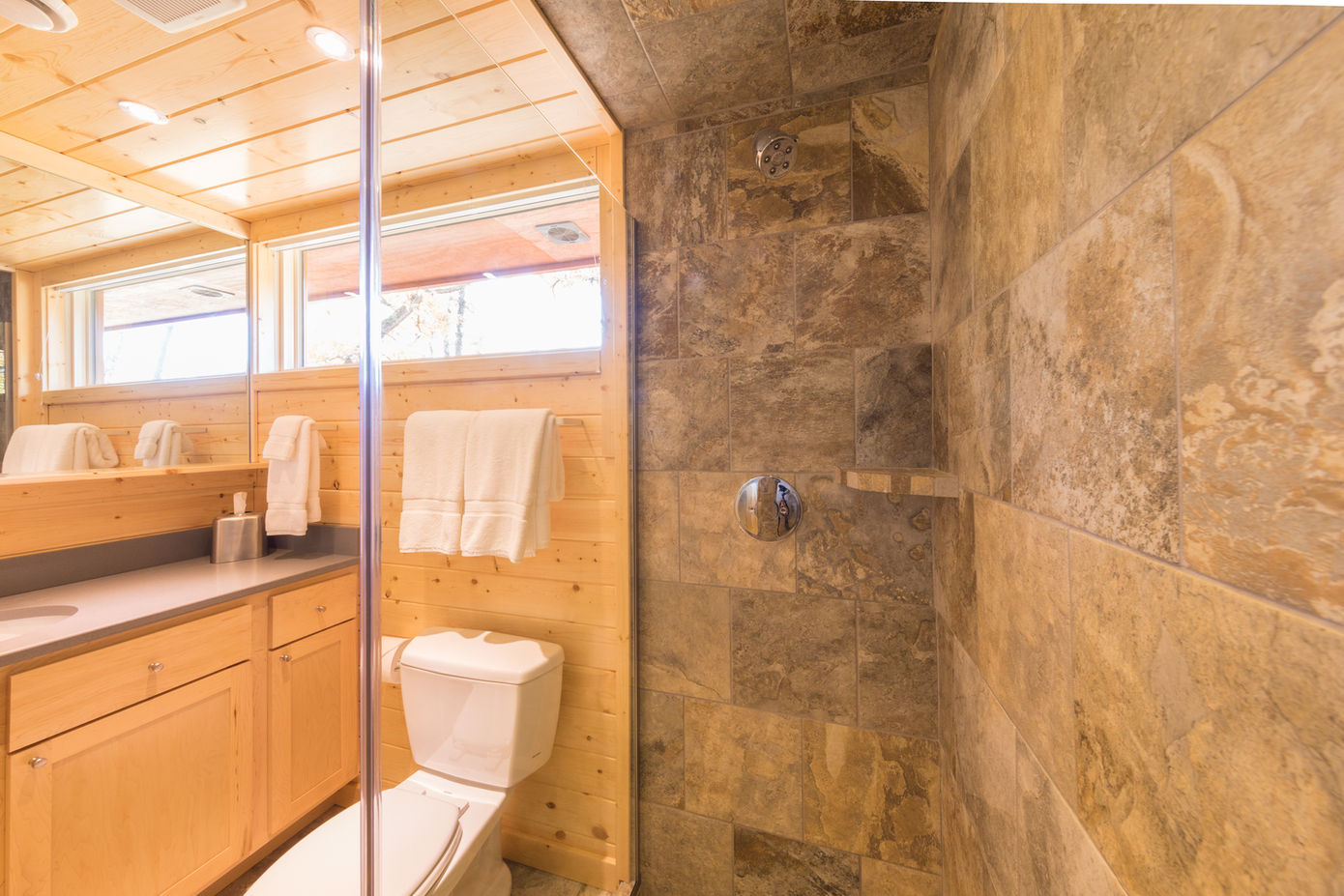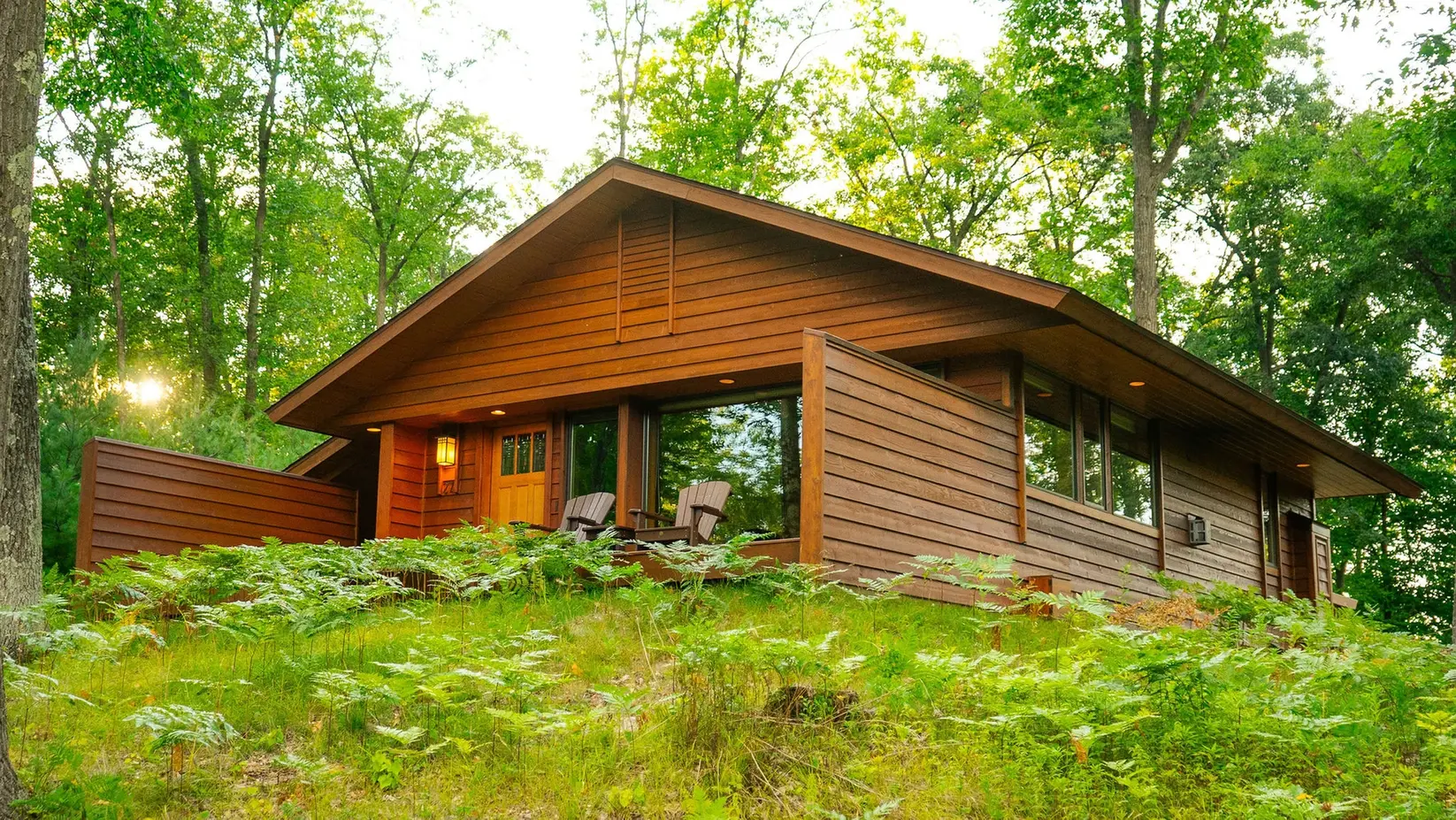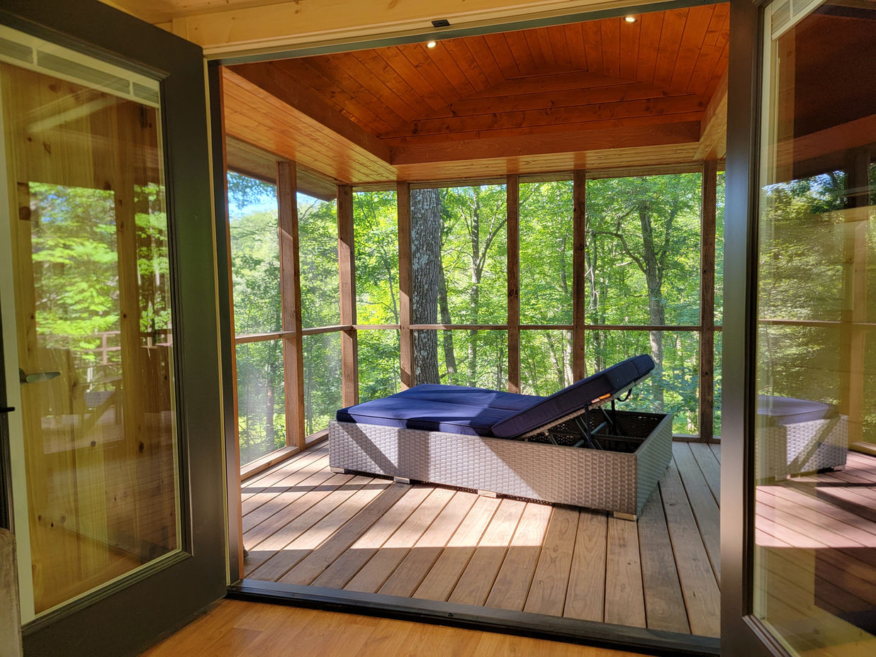 Just over a decade ago, the Classic Queen captivated audiences worldwide, featured in design publications from France to Australia to Japan. Perched on a hill just west of The Inn, each Classic Queen offers a living/dining room with a fireplace and a window wall showcasing views of hardwood forest. The queen bedroom includes an en-suite bathroom with a walk-in tile shower, double vanity, and a separate toilet room. Guests can relax on the seasonal screened porch with a chaise lounge and beautiful lake view. Amenities include a full-size fridge, microwave, and Keurig machine. ~400 sq.ft.