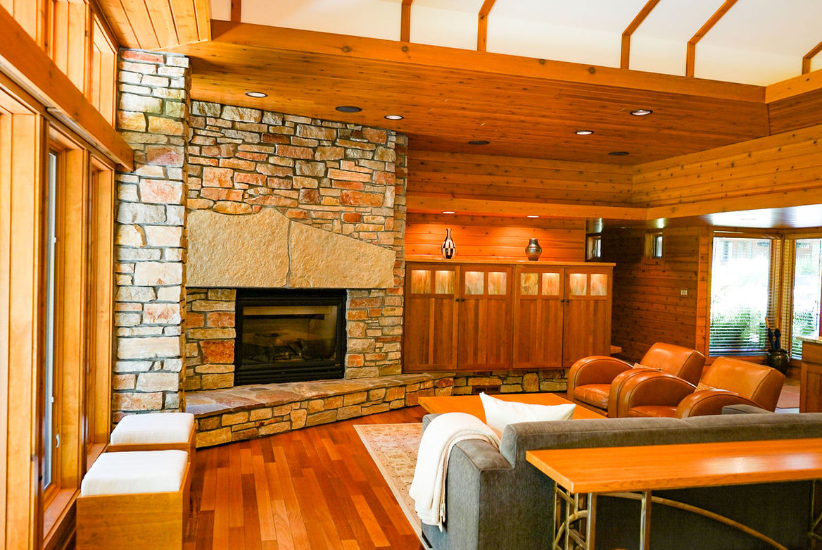 One of two Canoe Bay buildings designed by Frank Lloyd Wright protégé John Rattenbury. This cottage is set apart with inspiring Prairie-style architectural and the most dramatic lake view through floor-to-ceiling windows and a cantilevered deck. Located with ultimate privacy on the far west side of the property, the interior has a spacious open floor plan with a grand vaulted ceiling, unique build-ins, impressive stone fireplace and an exceptionally comfortable king bed. The bathroom features a two-person soaking tub/whirlpool, large walk-in shower, toilet room, and a double vanity. Wet bar includes a mini-fridge stocked with ice, microwave, and Nespresso machine. Carport. ~900 sq. ft.
